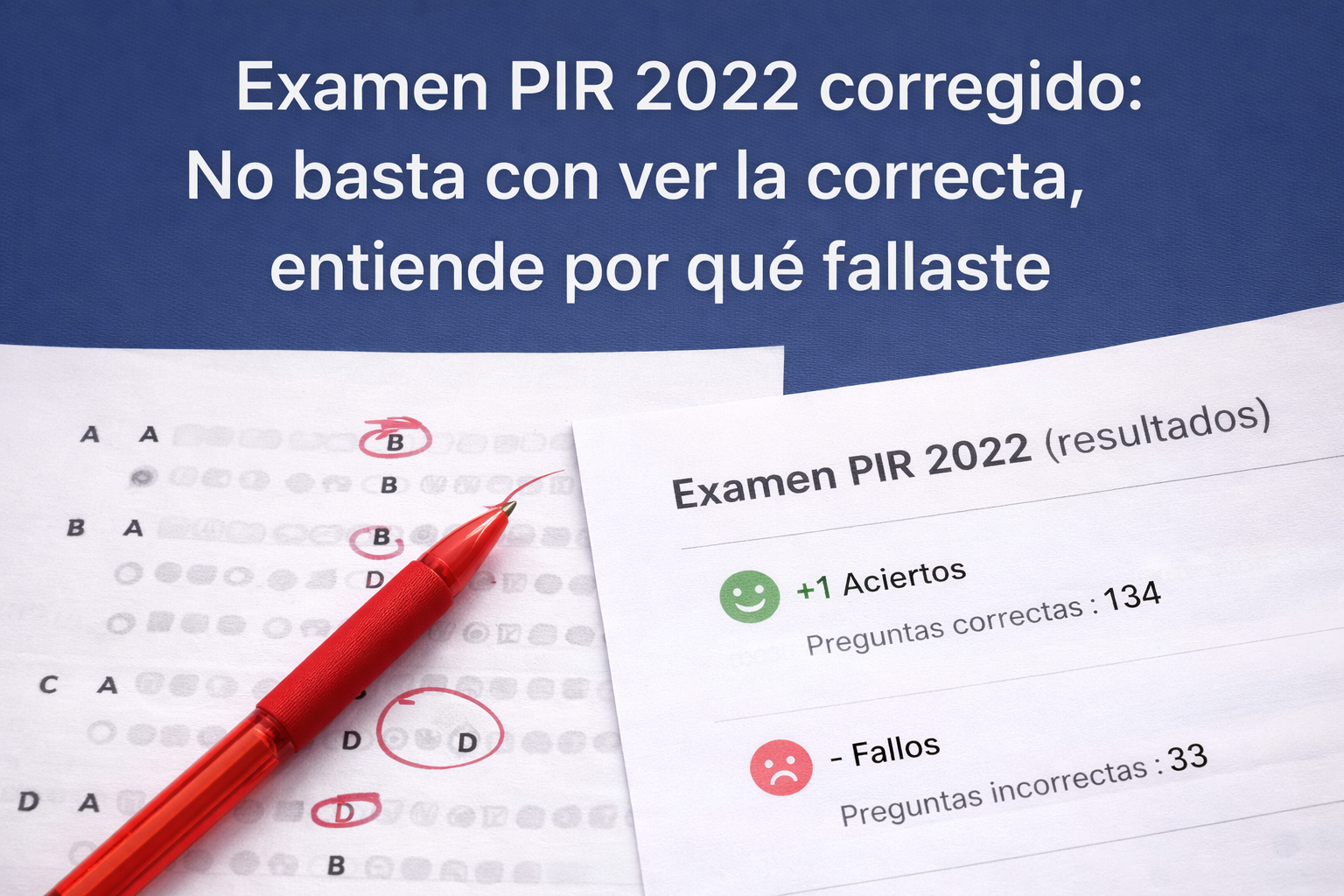 Cómo aprovechar el examen PIR 2022 corregido: plantilla vs comentado, errores típicos, y método para mejorar nota repitiendo falladas y reforzando temas.